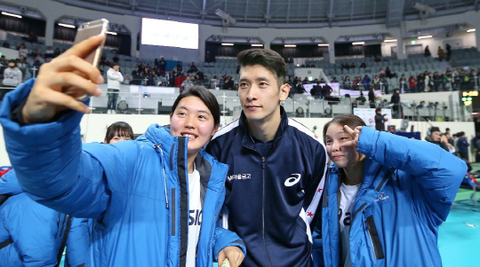 지난 시즌 올스타전에서 현대캐피탈의 문성민(가운데)이 팬들과 사진을 찍고 있다. 사진제공=한국배구연맹