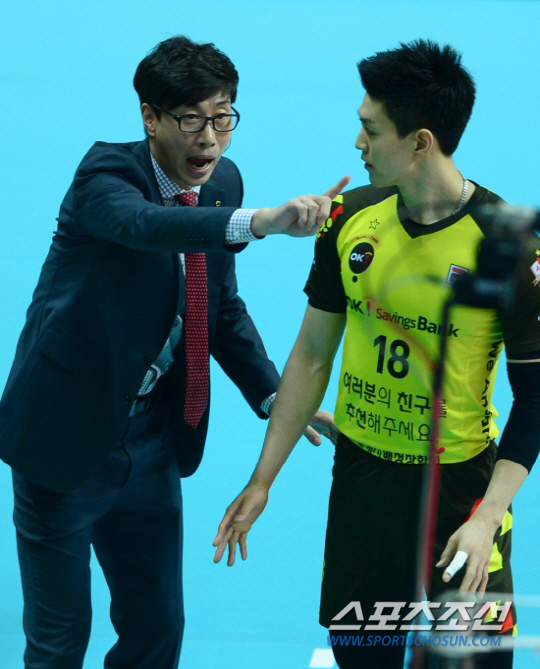 OK저축은행 주전급 선수들이 부상으로 신음하고 있다. 정규리그가 얼마 남지 않은 시점에서 김세진 OK저축은행 감독(왼쪽)이 '부상과의 전쟁'을 선포했다. 최대한 부상 발생을 방지하고 남은 선수들로 끝까지 이겨내겠다는 각오다. 사진은 김 감독이 지난달 26일 안산 상록수체육관에서 벌어진 삼성화재전에서 한상길에게 작전을 전달하는 모습. 안산=송정헌 기자