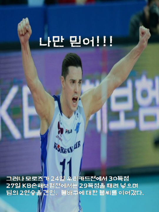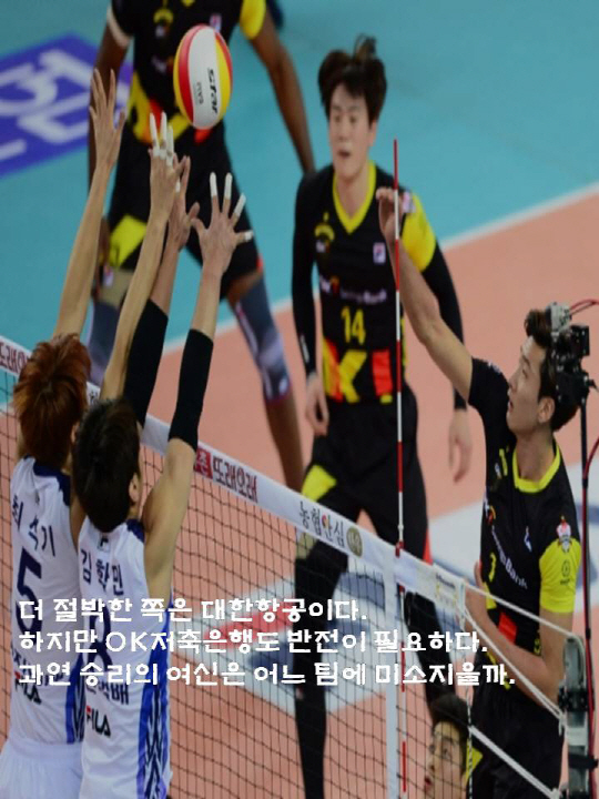2015~2016시즌 NH농협 V리그 남자부 4위 대한항공(19승15패·승점 58)이 2위 OK저축은행(22승12패·승점 68)과 29일 안산 상록수체육관에서 격돌한다. 봄배구가 달린 중요한 일전이다. 대한항공은 3위 삼성화재(21승12패·승점 60)과 승점 2점 차이다. 대한항공은 최근 부진을 씻어내고 2연승으로 분위기를 타고 있다. 대한항공의 봄배구. 끝까지 가봐야 안다.