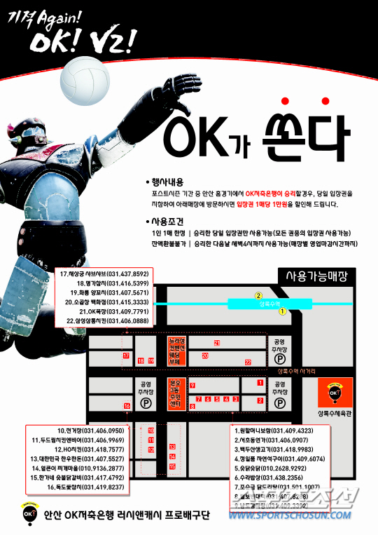OK저축은행은 최근 안산상록수체육관 인근 식당 22곳과 협력을 맺었다. 1인당 1만원의 식비를 지원하는 이벤트를 마련했다. 포스트시즌 기간 중 OK저축은행 홈경기 승리 시 노란색 상의를 착용하고 해당 업소에 당일경기 입장권을 제시하면 혜택을 받을 수 있다. 식비 지원 이벤트 관련 안내는 경기 당일 상록수체육관 입구에서 배포하는 팜플렛을 참조하면 된다.