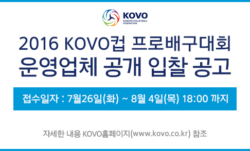 한국배구연맹(KOVO)이 2016년 KOVO컵 프로배구대회 운영 대행사를 입찰공고를 통해 모집한다.