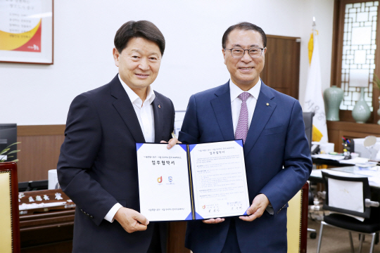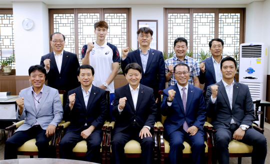 최창식 중구청장(왼쪽)과 유구현 우리카드 구단주가 기념사진을 촬영하고 있다. 사진제공=우리카드