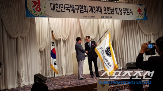 | 오한남 신임 대한배구협회장(오른쪽)이 25일 서울 리베라호텔에서 진행된 제39대 회장 취임식 중 홍병익 제주특별자치도배구협회장으로 부터 협회기를 전달받고 있다. 임정택 기자 lim1st@sportschosun.com |