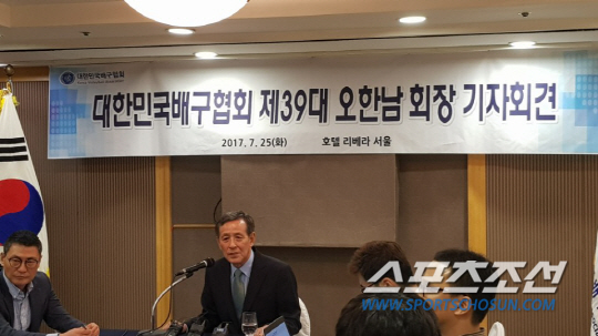 | 오한남 신임배구협회장(왼쪽에서 두 번째)이 25일 리베라호텔에서 진행된 취임식 기자회견에서 질의응답을 하고 있다. 임정택 기자 lim1st@sportschosun.com |