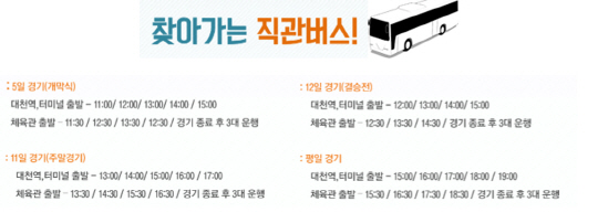 폭염 속에서 팬들이 편하게 경기장을 찾을 수 있도록 대천역과 보령터미널에서 출발하는 무료 셔틀버스를 운영할 예정이다. 5일 개막전을 시작으로 대회기간 중 매일 약 5대의 버스가 대천역과 보령터미널에서 경기장으로 운행되며 체육관에서 팬들을 다시 대천역과 보령터미널로 운행하는 약 7대의 셔틀버스가 운행될 예정이다.