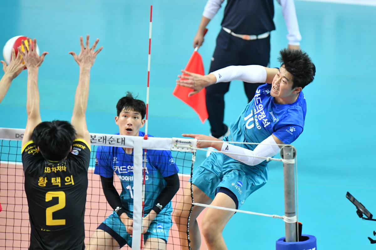 우리카드는 27일 서울 장충체육관에서 열린 KB손해보험과의 2019~2020시즌 도드람 V리그 남자부 1라운드 홈 개막전에서 먼저 2세트를 내주고 내리 3세트를 따내는 집중력을 발휘해 세트스코어 3대2(24-26, 20-25, 25-20, 25-21, 15-10)로 대역전승을 거뒀다.