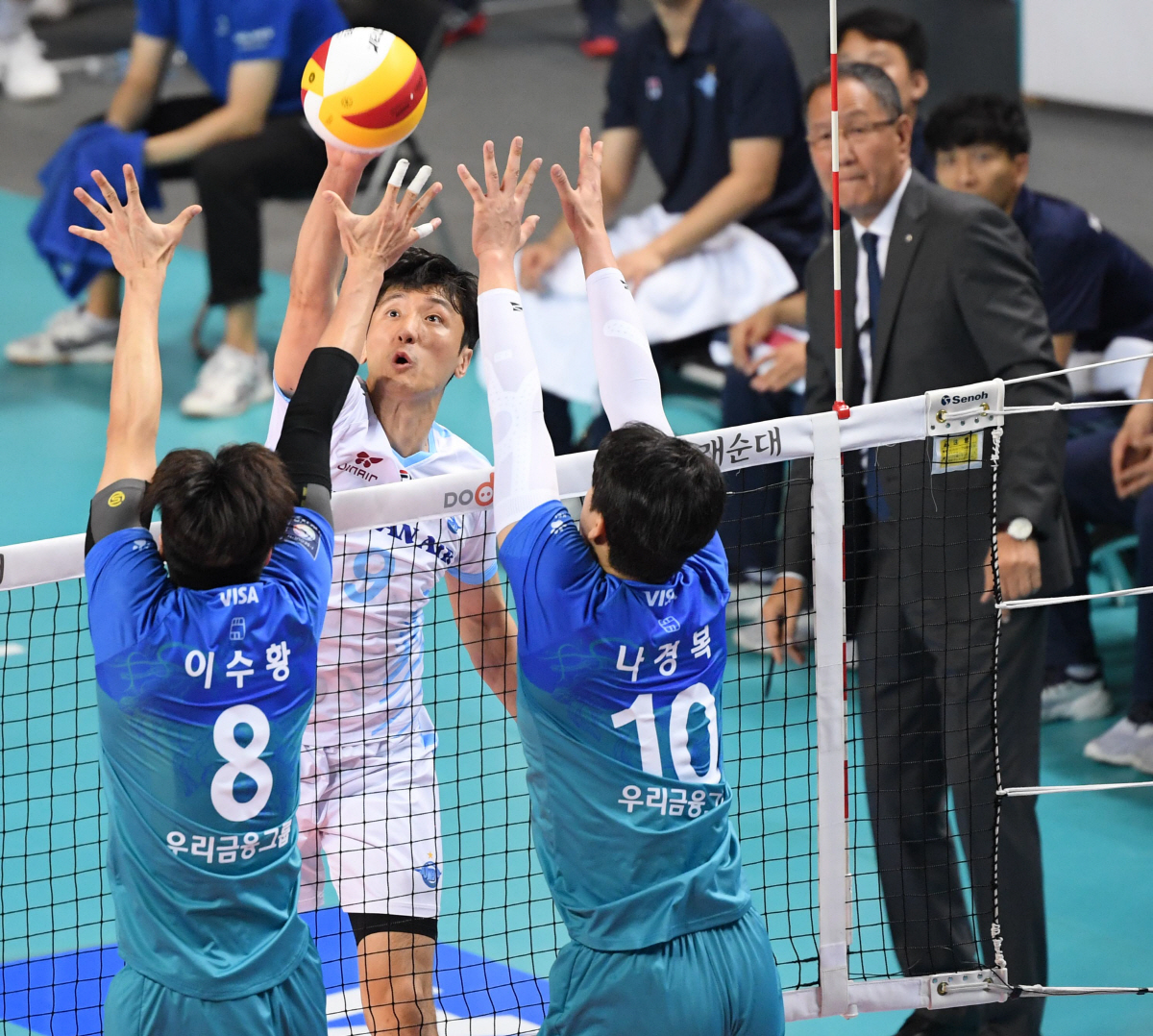우리카드와 대한항공의 2019-2010 V리그 남자부 경기가 31일 장충체육관에서 열렸다. 대한항공 곽승석이 우리카드 이수황, 나경복의 블로킹 사이로 공격을 시도하고 있다. 장충=허상욱 기자 wook@sportschosun.com/2019.10.31/