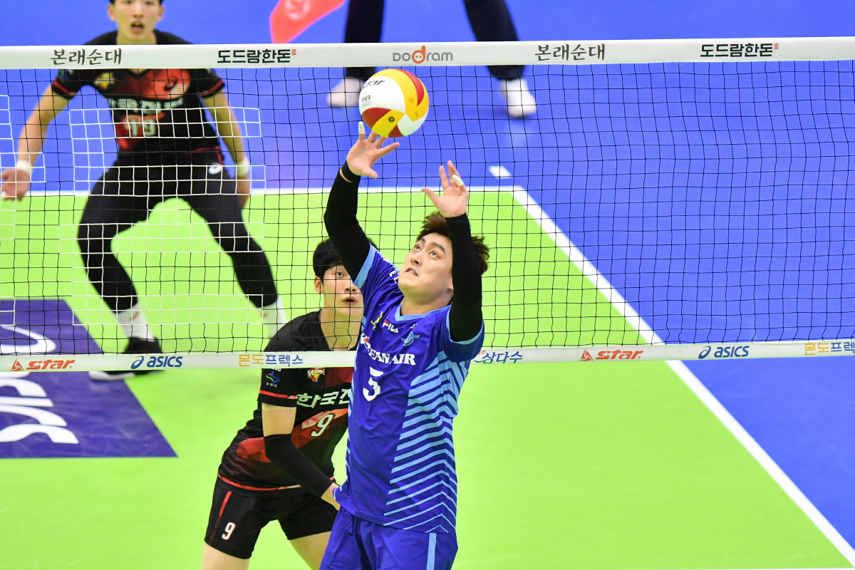 박기원 대한항공 감독이 한선수 부상으로 주전 세터로 나서고 있는 유광우에게 엄지를 세웠다.