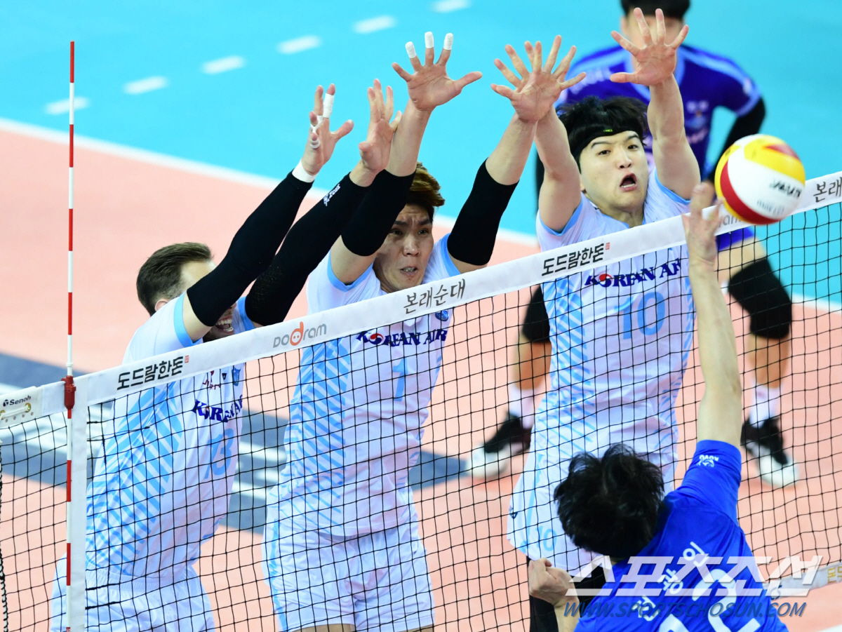 2019-2020 프로배구 V리그 대한항공과 현대캐피탈의 경기가 28일 인천계양체육관에서 열렸다. 대한항공 정지석과 김규민이 현대캐피탈 전광인의 공격을 막아내고 있다. 인천=최문영 기자 deer@sportschosun.com /2019.11.28/
