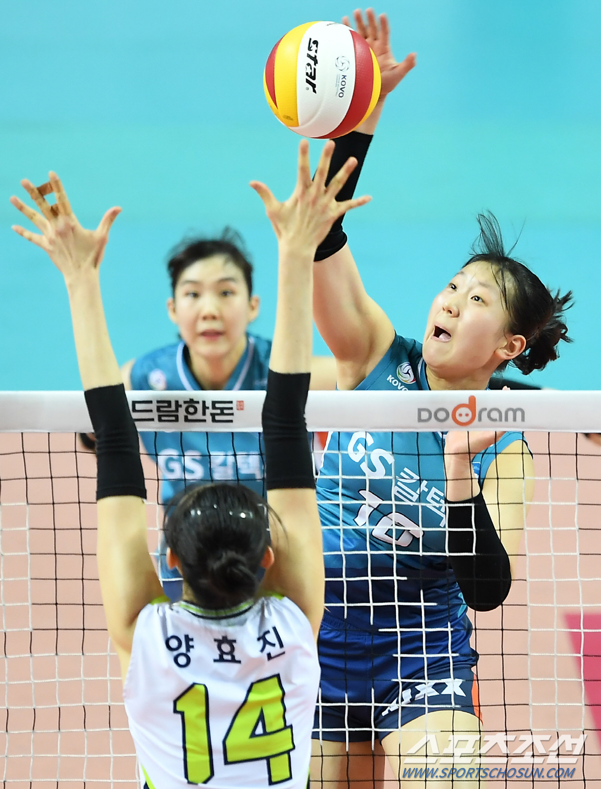 '2019-2020 V리그' 여자부 GS칼텍스와 현대건설의 경기가 23일 오후 서울 장충체육관에서 열렸다. GS칼텍스 권민지가 블로킹 벽을 피해 공격을 시도하고 있다. 장충=박재만 기자 pjm@sportschosun.com/2020.02.23/