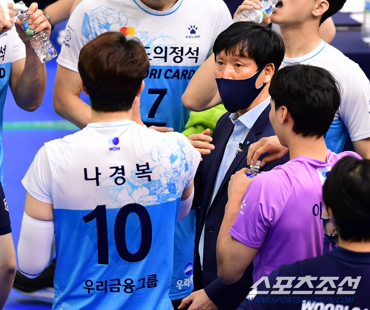 2020-2021 V리그 남자부 한국전력과 우리카드의 경기가 28일 수원체육관에서 열렸다. 우리카드 신영철 감독이 작전타임에서 나경복과 얘기하고 있다. 수원=정재근 기자 cjg@sportschosun.com/2021.1.28/