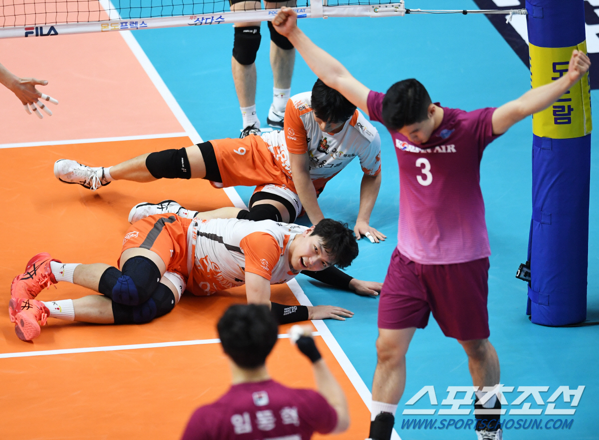 하지만 경기는 예상과는 다르게 흘렀다. 꼭 이겨야한다는 부담 때문이었을까. OK금융그룹 선수들의 움직임이 활발하지 않았다. 1,2세트에선 접전이 아닌 대한항공의 완승이었다. KB손해보험이 준PO진출이 확정된 순간.