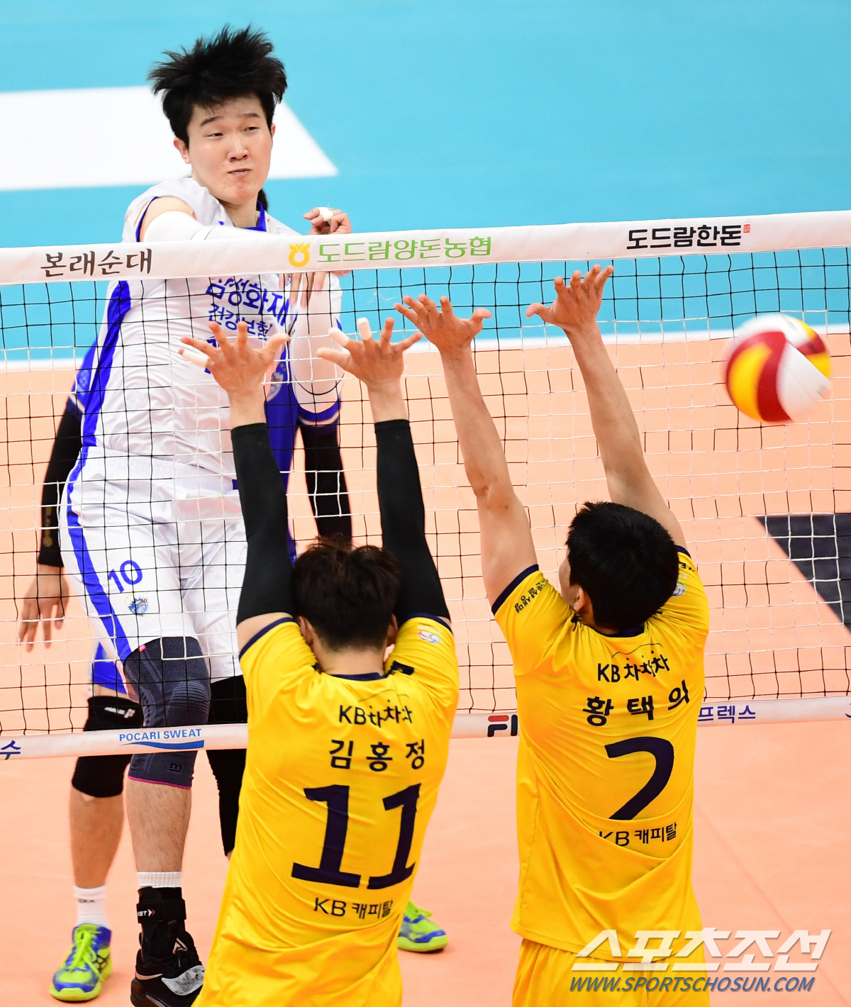 2021-2022 프로배구 V리그 KB손해보험과 삼성화재의 경기가 28일 의정부체육관에서 열렸다. 삼성화재 안우재가 KB손해보험 김홍정의 블로킹 사이로 스파이크를 강타하고 있다. 의정부=최문영 기자 deer@sportschosun.com /2021.11.28/