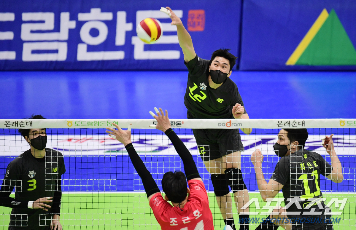 6일 수원체육관에서 배구 V리그 남자부 한국전력과 현대캐피탈의 경기가 열렸다. 현대캐피탈 전광인이 한국전력 블로킹을 앞에 두고 스파이크를 날리고 있다. 수원=송정헌 기자songs@sportschosun.com/2022.03.06/