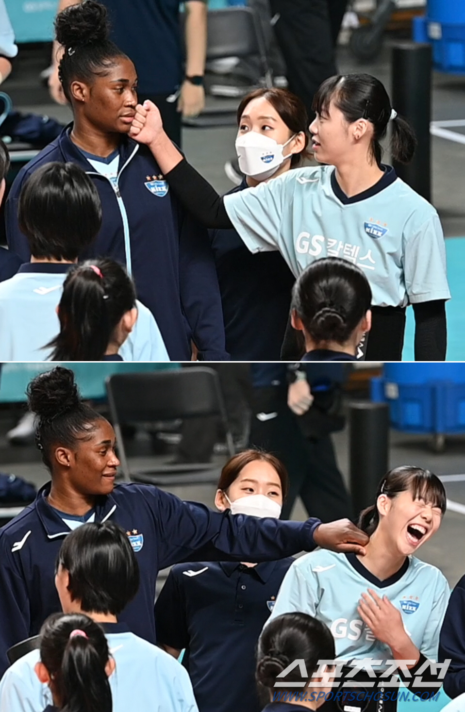 GS칼텍스의 주포인 모마와 유서연의 절친케미가 돋보이는 순간이 포착됐다.