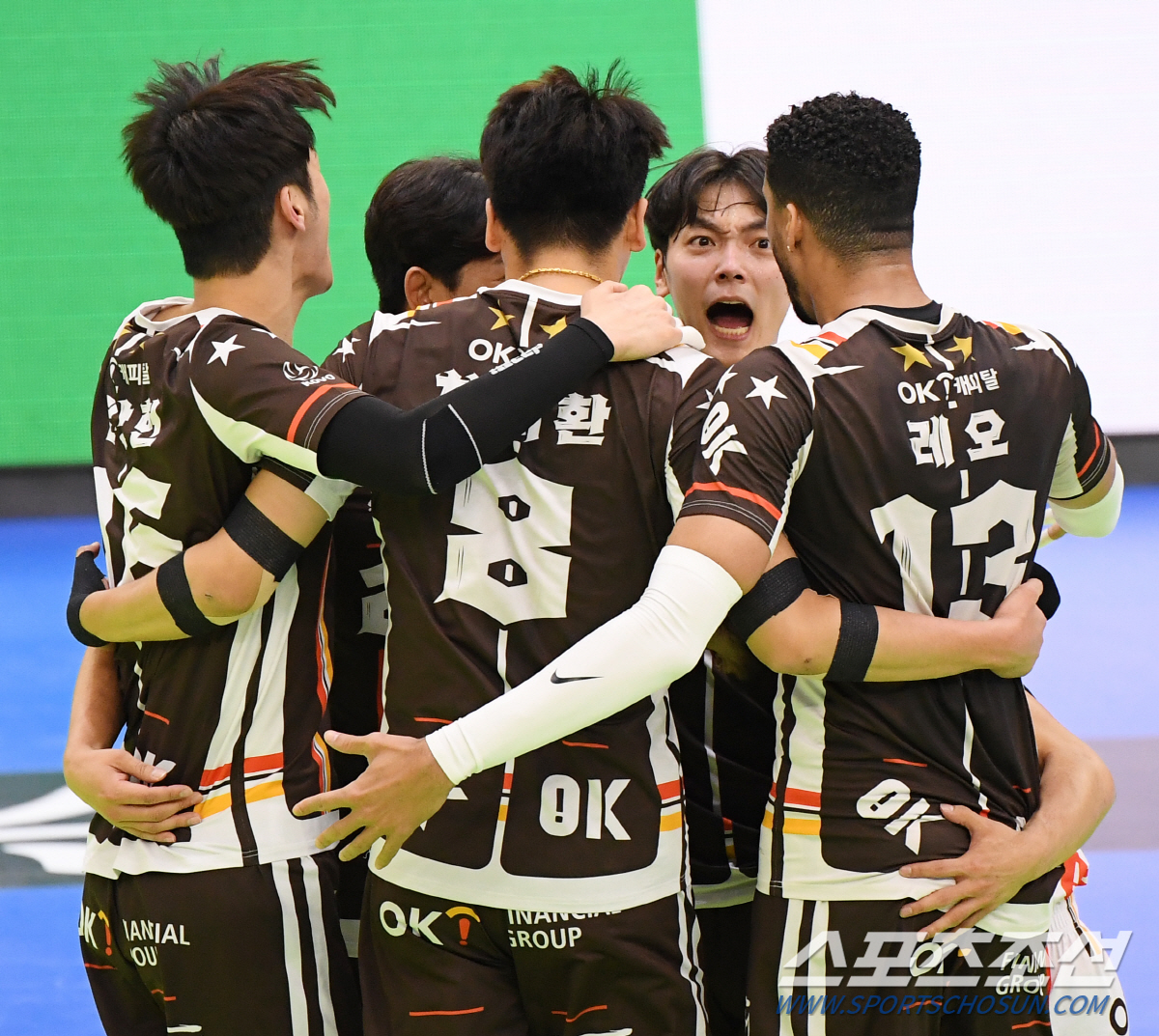 23일 오후 수원체육관에서 열린 프로배구 V리그 한국전력과 OK금융그룹 경기. OK 선수들이 득점 후 환호하고 있다. 수원=정재근 기자 cjg@sportschosun.com/2022.11.23/