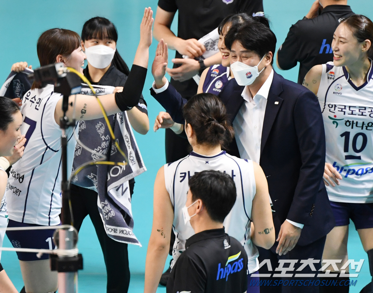 도로공사 김종민 감독이 기뻐하며 선수들을 맞이하고 있다. 장충체=정재근 기자 cjg@sportschosun.com/2022.11.26/
