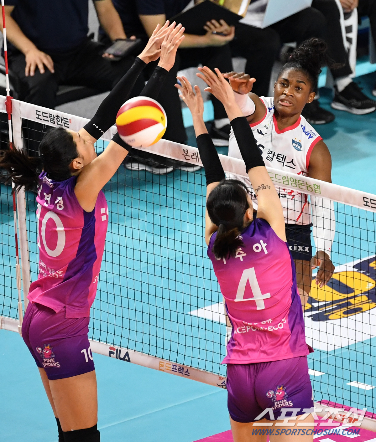 2세트 흐름도 비슷했다. 흥국생명의 공격이 번번이 빗나가면서 GS칼텍스가 초반부터 리드를 잡았다. 모마는 중요한 순간마다 강스파이크를 때리며 점수를 차곡차곡 만들어갔다. 전체적인 공격성공율에서 GS칼텍스가 현저하게 앞섰다.