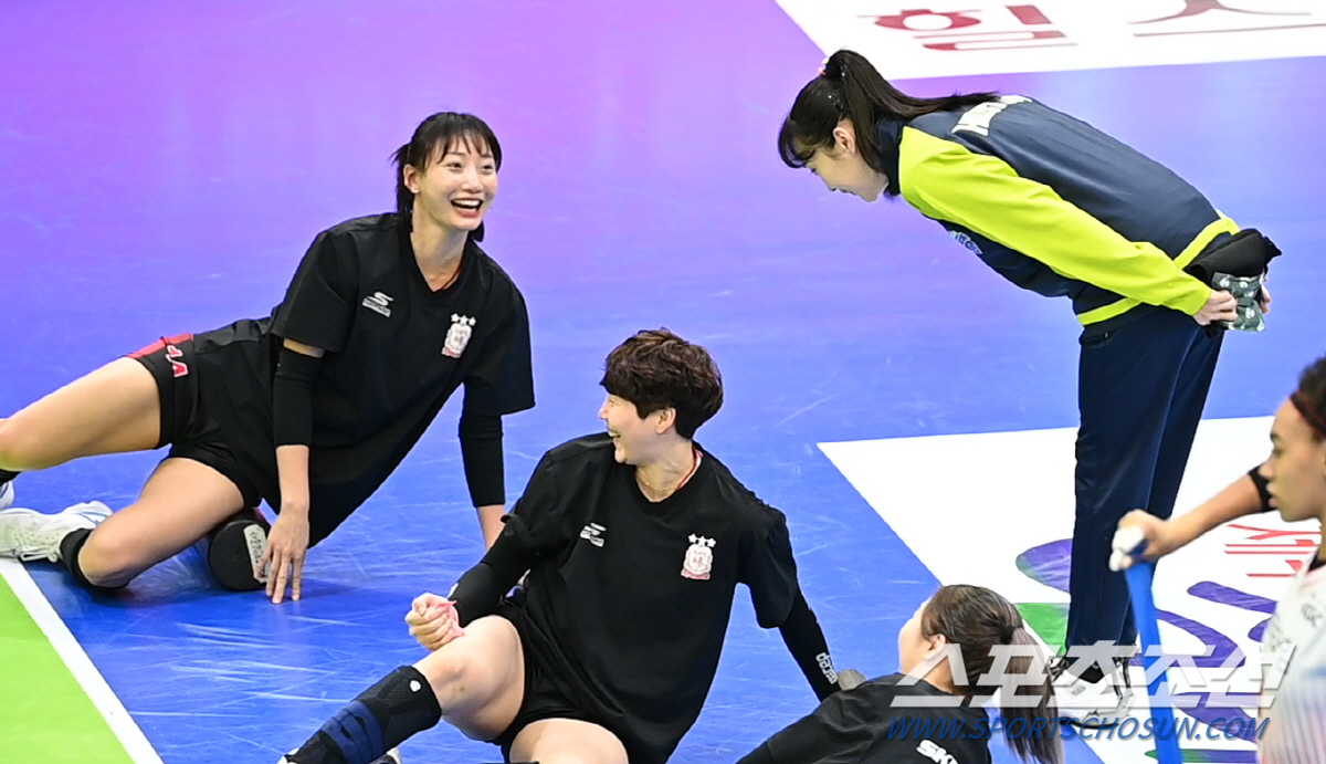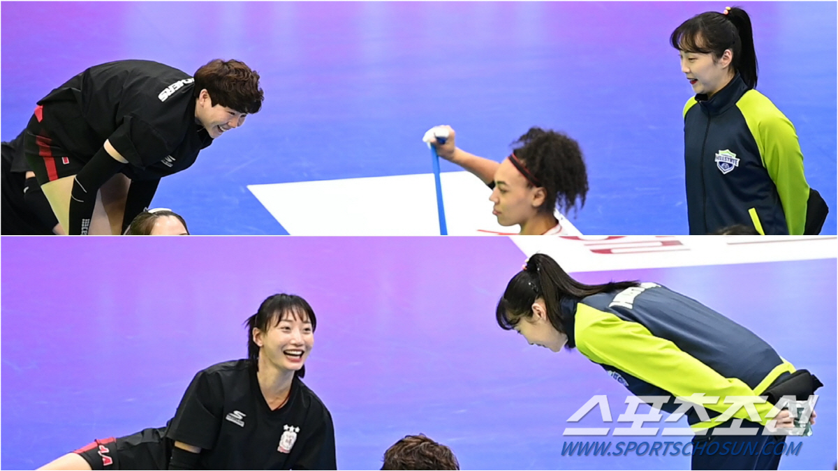 인삼공사에서 현대건설로 팀을 옮긴 나현수가 정호영에게 다가와 반가움에 진한 포옹을 했고 먼저 코트에 나와 있던 박혜민은 황민경을 보며 애정 가득한 인사를 했다.