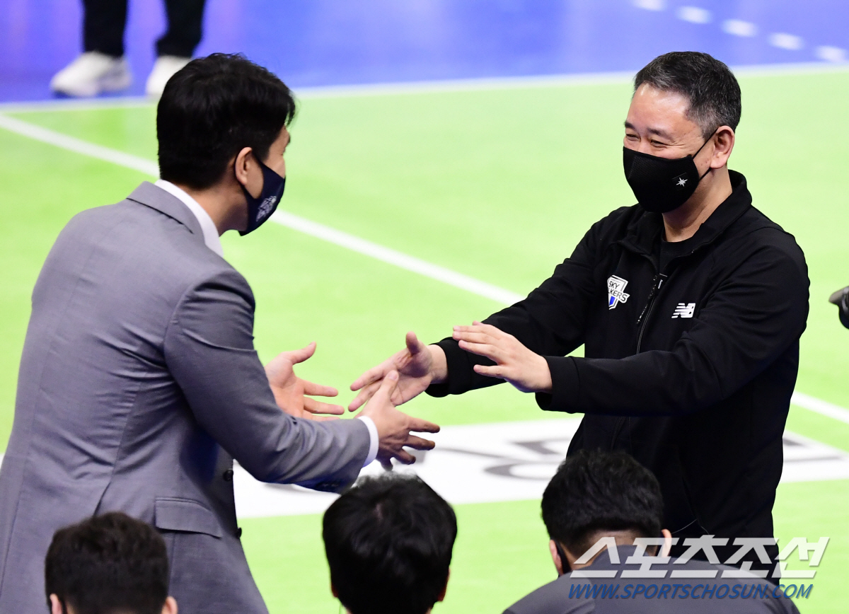5일 수원체육관에서 배구 V리그 남자부 한국전력과 현대캐피탈의 경기가 열렸다. 한국전력 권영민 감독과 현대캐피탈 최태웅 감독이 인사를 나누고 있다. 수원=송정헌 기자songs@sportschosun.com/2023.02.05/