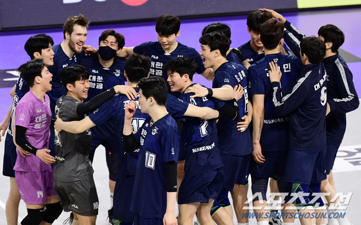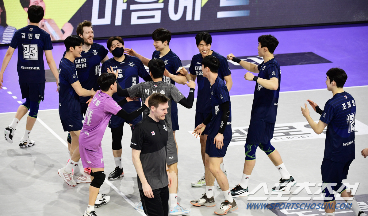 | 대한항공이 KB손해보험에 세트스코어 3대 1로 승리했다. 경기 종료 후 승리의 기쁨을 나누고 있는 대한항공 선수들. |