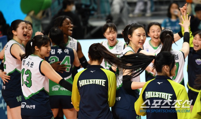 V리그 여자부 GS칼텍스와 현대건설의 경기가 1일 장충체육관에서 열렸다. 경기에서 승리한 현대건설 선수들이 환호하고 있다. 장충=박재만 기자 pjm@sportschosun.com/2023.03.01/