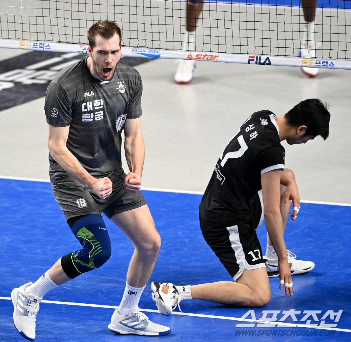 V리그 남자부 챔피언결정전 3차전 현대캐피탈과 대한항공의 경기가 3일 천안유관순체육관에서 열렸다. 대한항공 링컨이 공격을 성공한 후 환호하고 있다. 천안=허상욱 기자wook@sportschosun.com/2023.04.03/