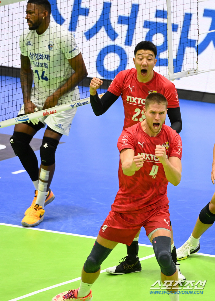 외국인 선수 타이스가 30득점 4블록으로 공격을 이끌었고, '수원 왕자' 임성진(16득점 3블록)이 고비마다 빛났다. 특히 승부의 분수령이 된 3세트 막판 혼자 4연속 득점을 올리며 분위기를 완전히 바꿔놓는 활약이 돋보였다. 삼성화재는 요스바니(33득점)가 분투했지만, 고비마다 범실에 무너졌다.