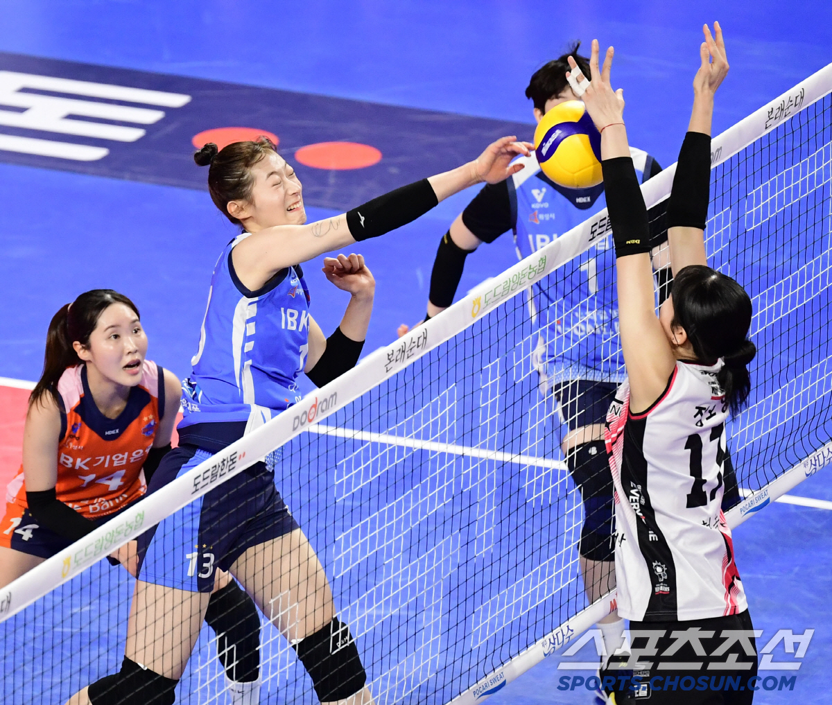 14일 화성 종합실내체육관에서 열린 배구 V리그 여자부 IBK기업은행과 정관장 경기. IBK 최정민이 정관장 블로킹을 앞에 두고 스파이크를 날리고 있다. 화성=송정헌 기자songs@sportschosun.com/2025.01.14/