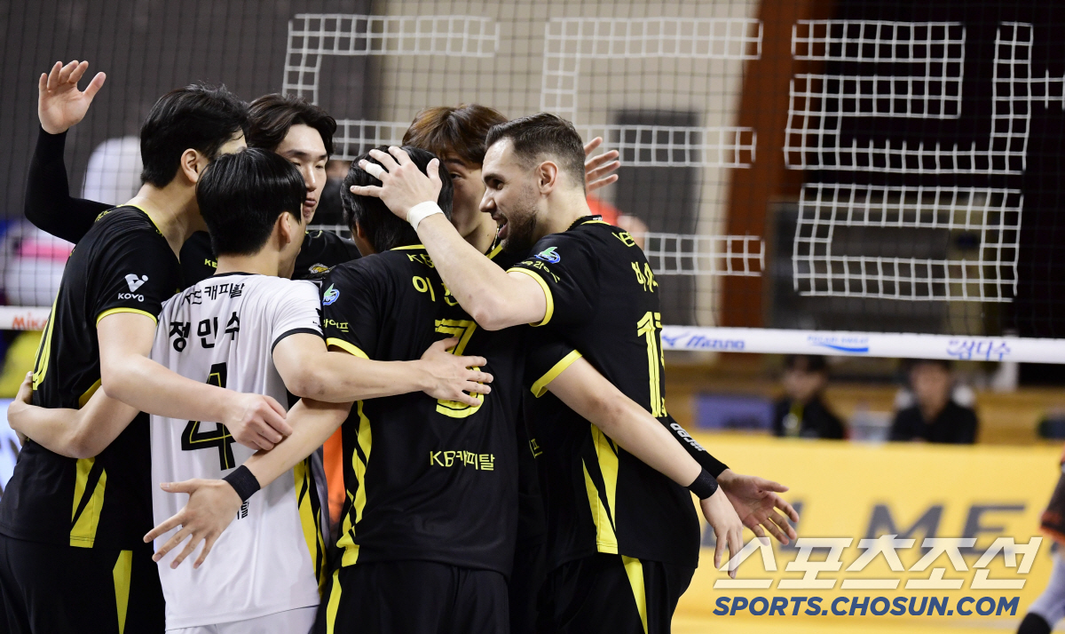 16일 의정부 경민대학교 기념관에서 배구 V리그 남자부 KB손해보험과 OK저축은행의 경기가 열렸다. 1세트를 따낸 KB손해보험 선수들이 기쁨을 나누고 있다. 의정부=송정헌 기자songs@sportschosun.com