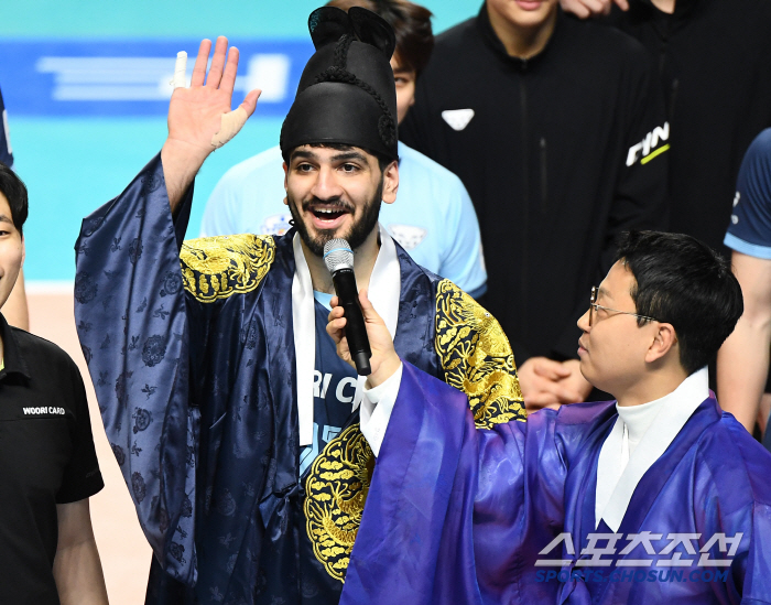 | 포졸 모자를 쓰고 등장해 큰 웃음을 준 알리. 경기 후에는 MVP에 뽑혀 곤룡포를 입고 팬들을 향해 세배했다. 장충체=정재근 기자 cjg@sportschosun.com |