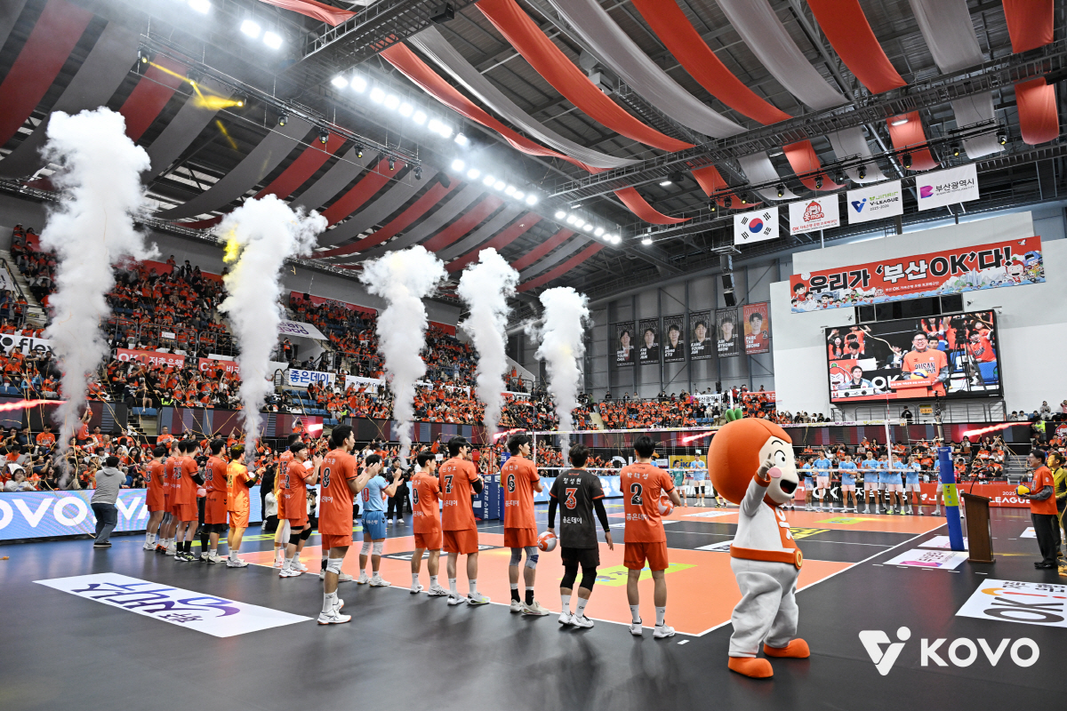 V리그 남자부 OK저축은행이 9일 역사적인 부산 홈 개막전을 성황리에 마쳤다. OK저축은행은 이날 부산 강서체육관에서 열린 진에어 2025~2026 V리그 대한항공과의 경기에서 4270석이 전석 매진된 가운데 세트스코어 0대3으로 패했다. 사진제공=KOVO