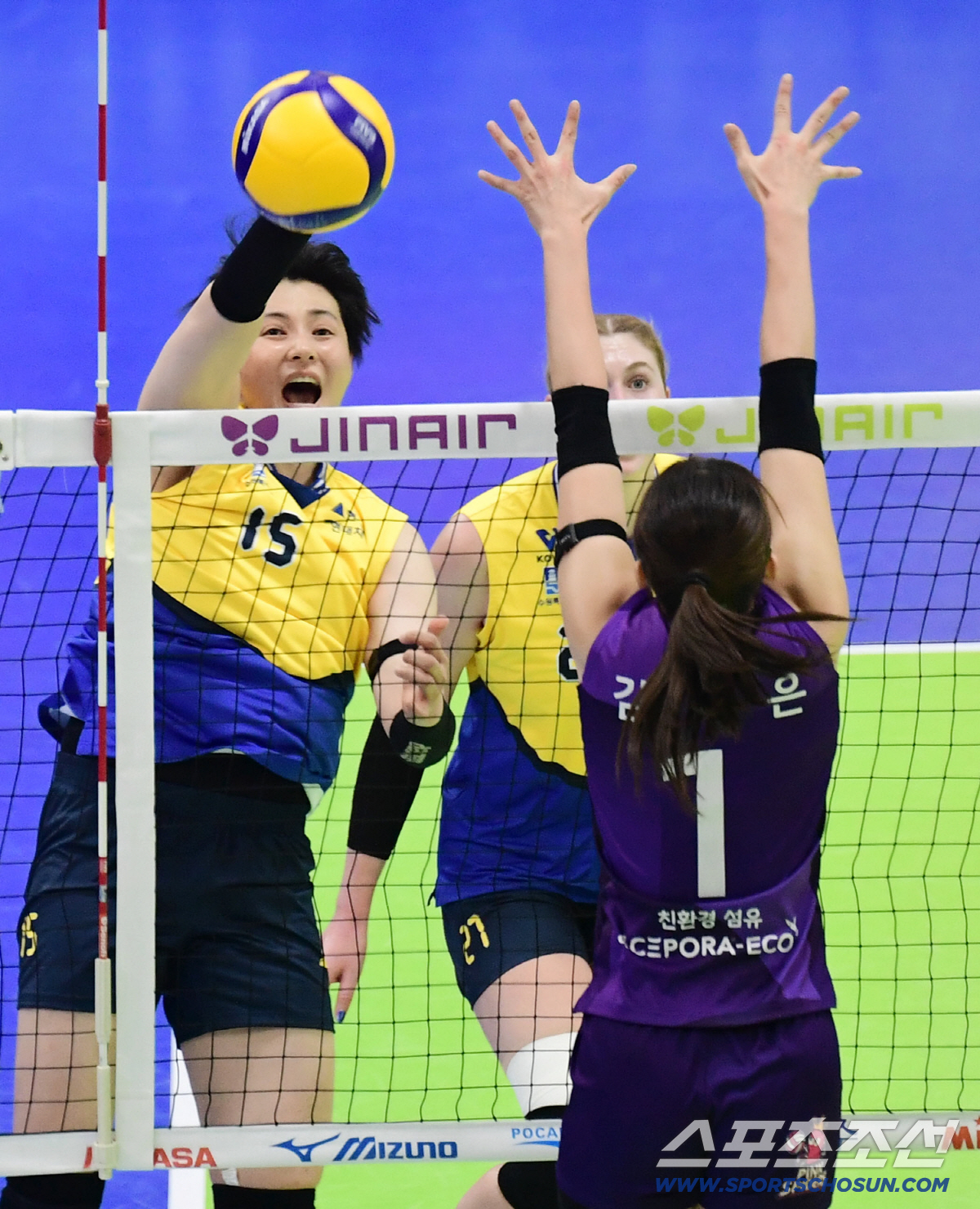 29일 수원체육관에서 열린 배구 V리그 여자부 흥국생명과 현대견설의 경기. 현대건설 김희진이 흥국생명 블로킹을 앞에 두고 스파이크를 날리고 있다. 수원=송정헌 기자songs@sportschosun.com