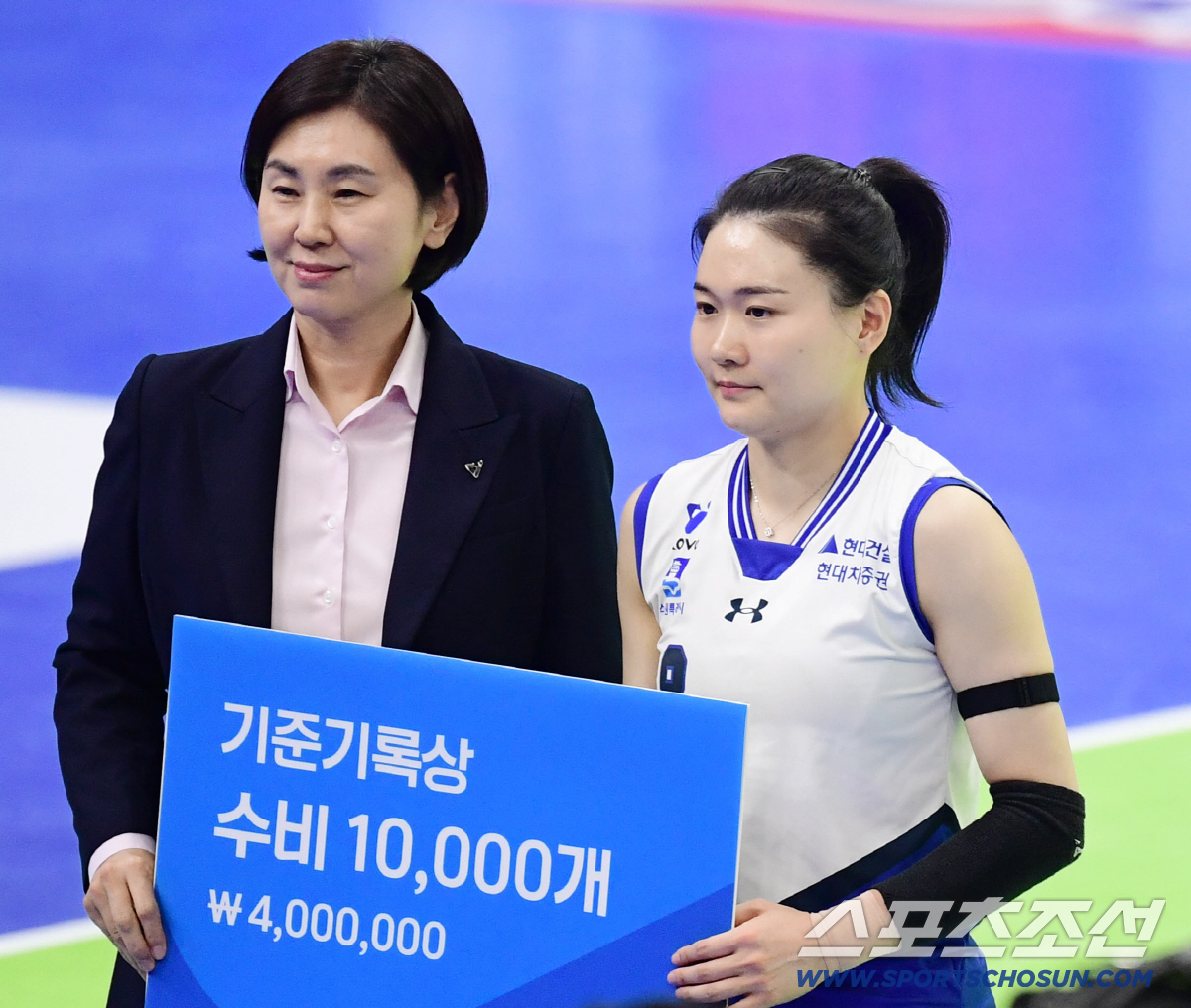 29일 수원체육관에서 열린 배구 V리그 여자부 흥국생명과 현대견설의 경기. 개인 수비 '10,000개'를 달성한 현대건설 리베로 김연견이 수상하고 있다. 수원=송정헌 기자songs@sportschosun.com
