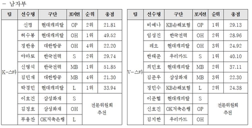 남자부에선 베테랑 미들 블로커 신영석(한국전력)이 통산 13번째 출전을 노린다.
