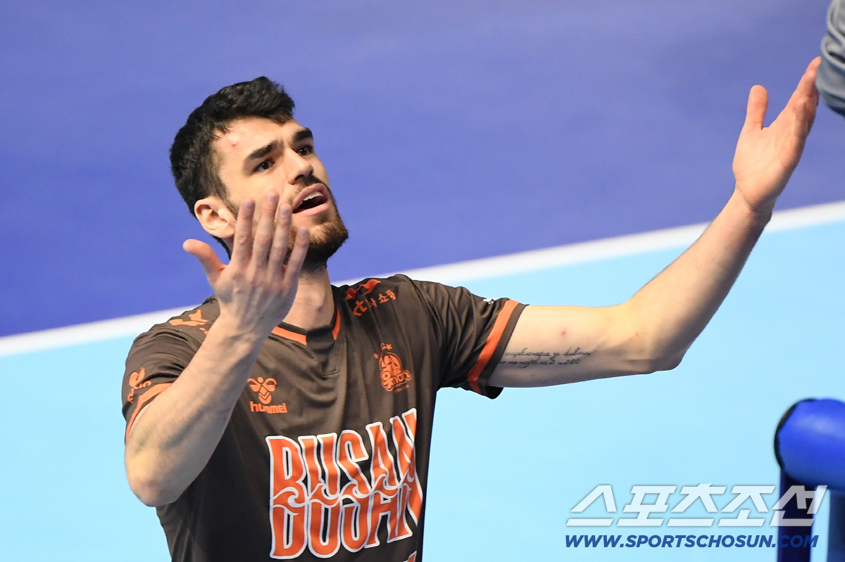 21일 인천 계양체육관에서 열린 V리그 대한항공-OK저축은행전. OK저축은행 디미트로프가 심판 판정에 아쉬워하고 있다. 인천=정재근 기자 cjg@sportschosun.com/2025.11.21/
