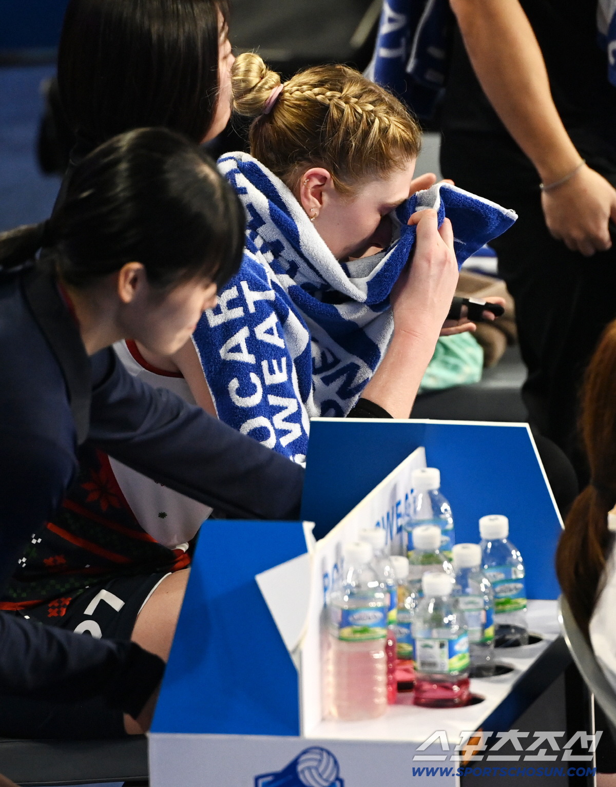 21일 화성종합실내체육관에서 열린 V리그 여자부 IBK기업은행과 현대건설의 경기, 3세트 현대건설 카리가 공격 도중 무릎 부상을 당해 벤치에 앉아 아쉬워하고 있다. 화성=허상욱 기자wook@sportschosun.com