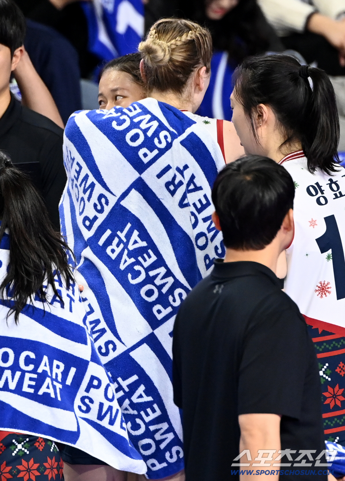 21일 화성종합실내체육관에서 열린 V리그 여자부 IBK기업은행과 현대건설의 경기, 3세트 도중 무릎 부상을 당해 빠진 현대건설 카리가 나현수를 안아주고 있다. 화성=허상욱 기자wook@sportschosun.com
