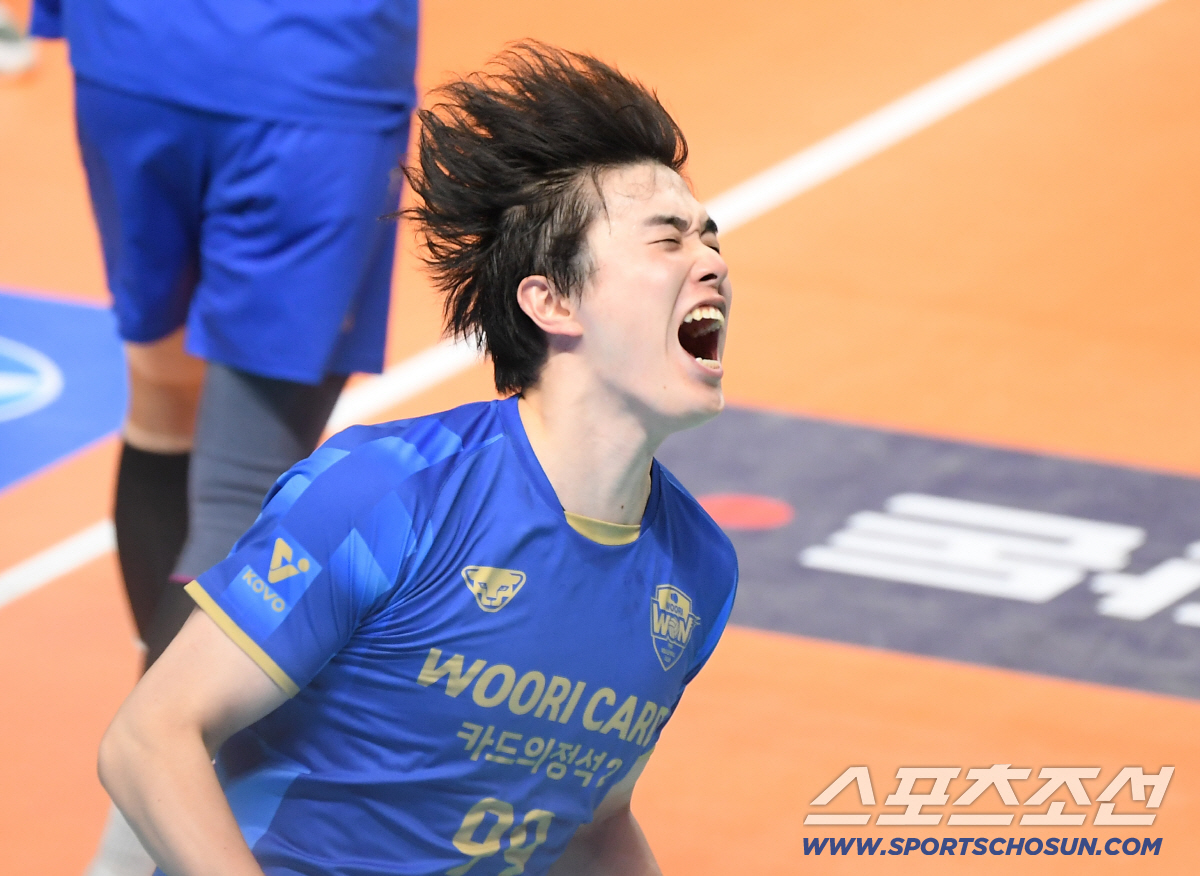 4일 서울 장충체육관에서 열린 V리그 우리카드-대한항공전. 우리카드 김지한이 득점 후 환호하고 있다. 장충체=정재근 기자 cjg@sportschosun.com/2025.12.4/