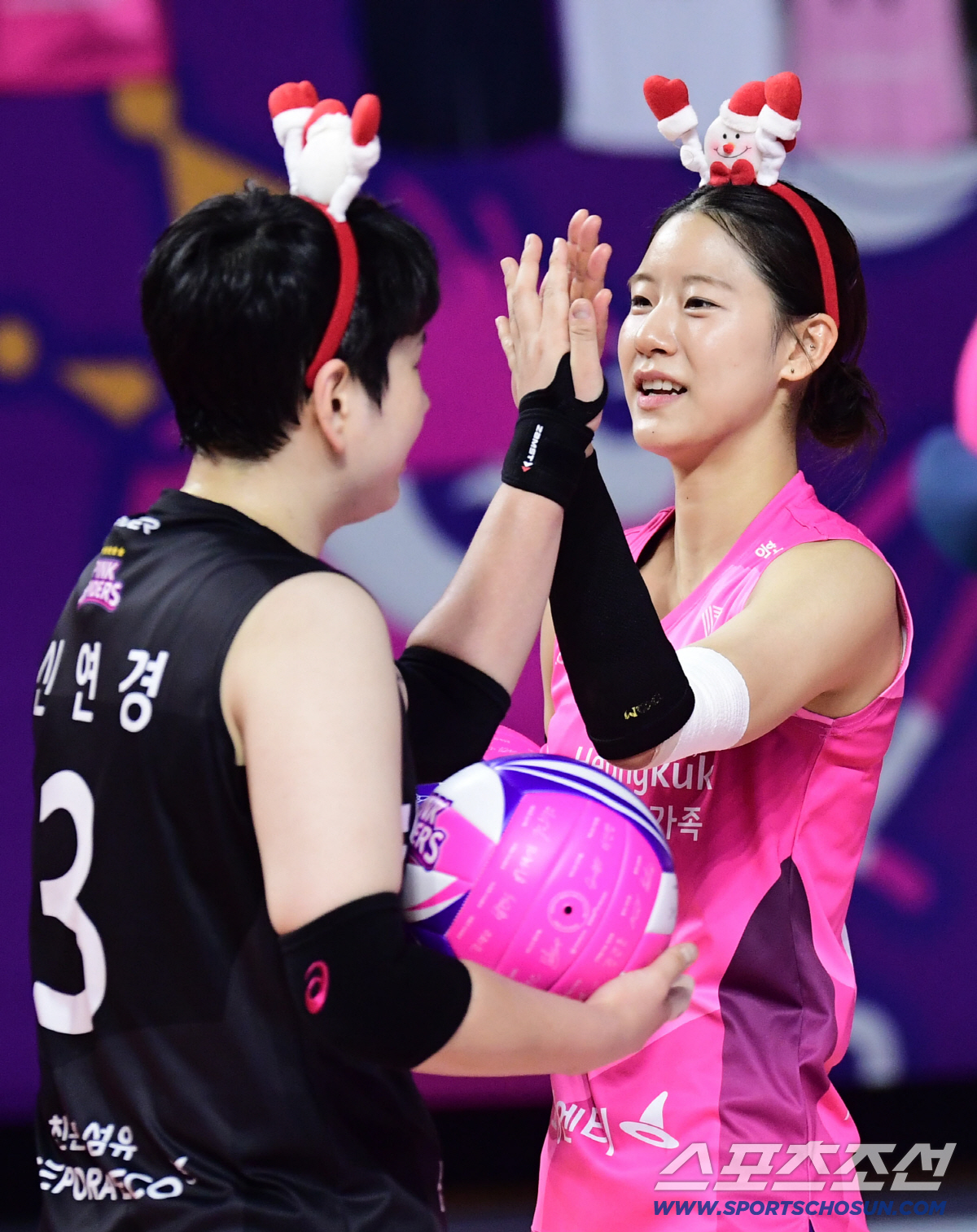 24일 인천 삼산월드체육관에서 열린 V리그 여자부 흥국생명과 IBK기업은행의 경기. 크리스마스를 앞두고 산타 모자띠를 착용하고 입장한 흥국생명 신연경, 박민지. 인천=송정헌 기자songs@sportschosun.com/2025.12.24/