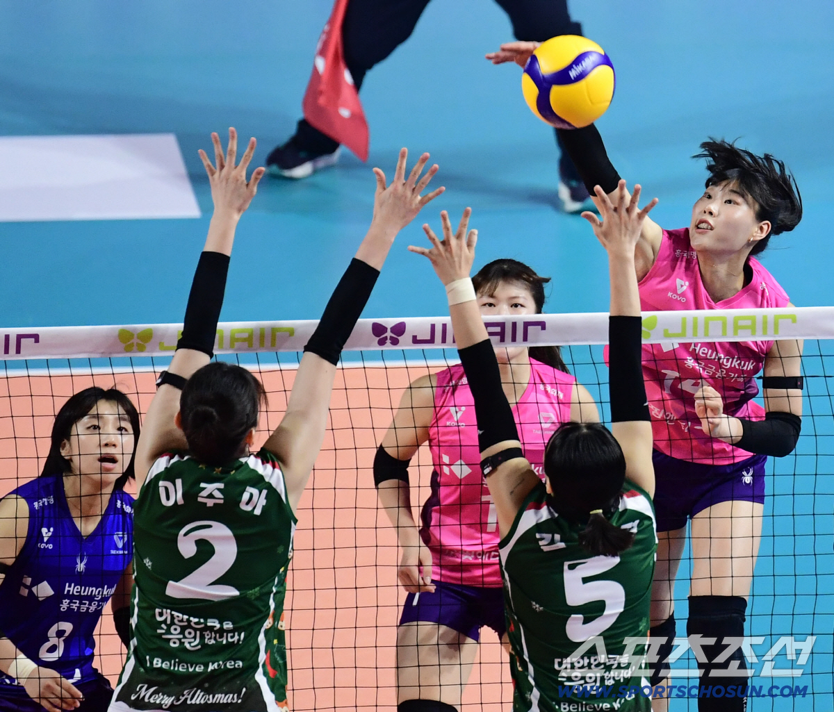 24일 인천 삼산월드체육관에서 열린 V리그 여자부 흥국생명과 IBK기업은행의 경기. 흥국생명 정윤주가 IBK기업은행 블로킹을 앞에 두고 스파이크를 날리고 있다. 인천=송정헌 기자songs@sportschosun.com/2025.12.24/