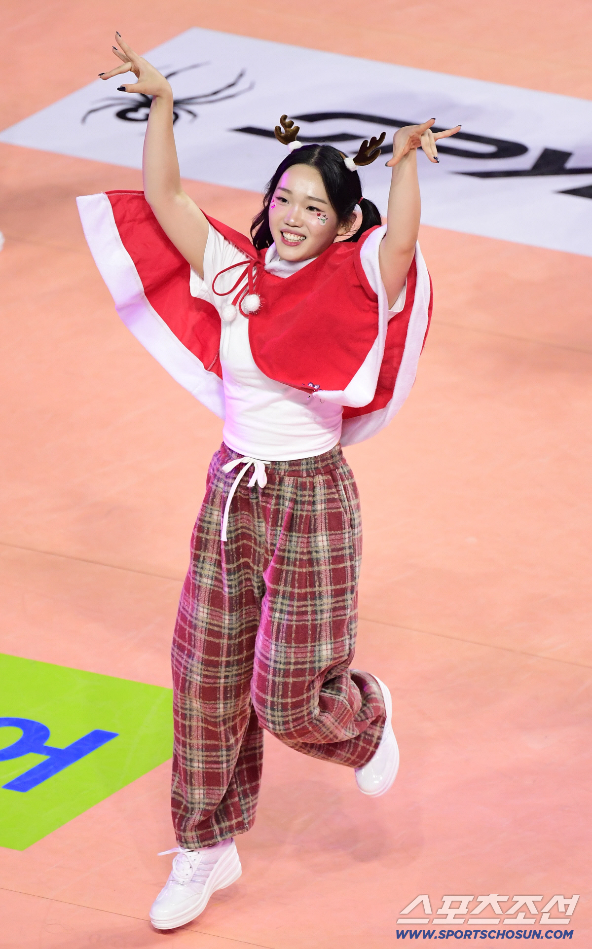 24일 인천 삼산월드체육관에서 열린 V리그 여자부 흥국생명과 IBK기업은행의 경기. 산타 복장으로 무대를 펼치고 있는 흥국생명 치어리더들. 인천=송정헌 기자songs@sportschosun.com