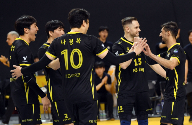 18일 의정부 경민대학교 체육관에서 열린 V리그 남자부 KB손해보험과 삼성화재의 경기. 승리한 KB손해보험 선수들이 기뻐하고 있다. 의정부=박재만 기자 pjm@sportschosun.com/2025.12.18/