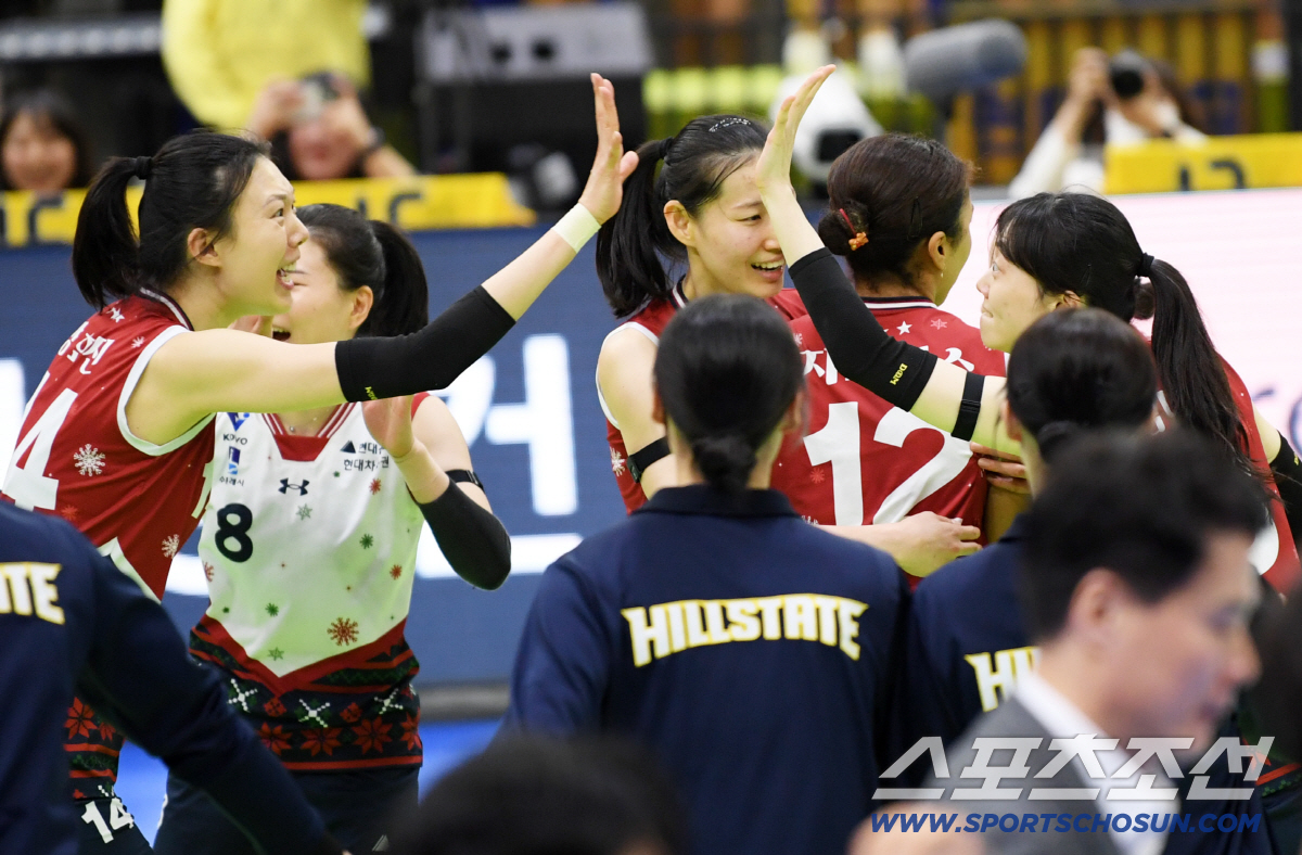 25일 수원체육관에서 열린 V리그 현대건설과 정관장의 경기. 5세트 접전 끝 승리한 현대건설 선수들이 기뻐하고 있다. 수원=박재만 기자 pjm@sportschosun.com