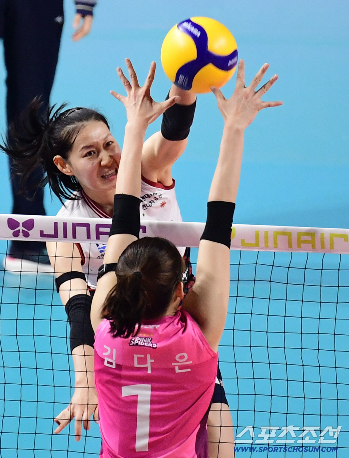 31일 인천 삼산월드체육관에서 열린 V리그 여자부 흥국생명과 현대건설의 경기. 현대건설 나현수가 흥국생명 블로킹을 앞에두고 스파이크를 날리고 있다. 인천=송정헌 기자songs@sportschosun.com
