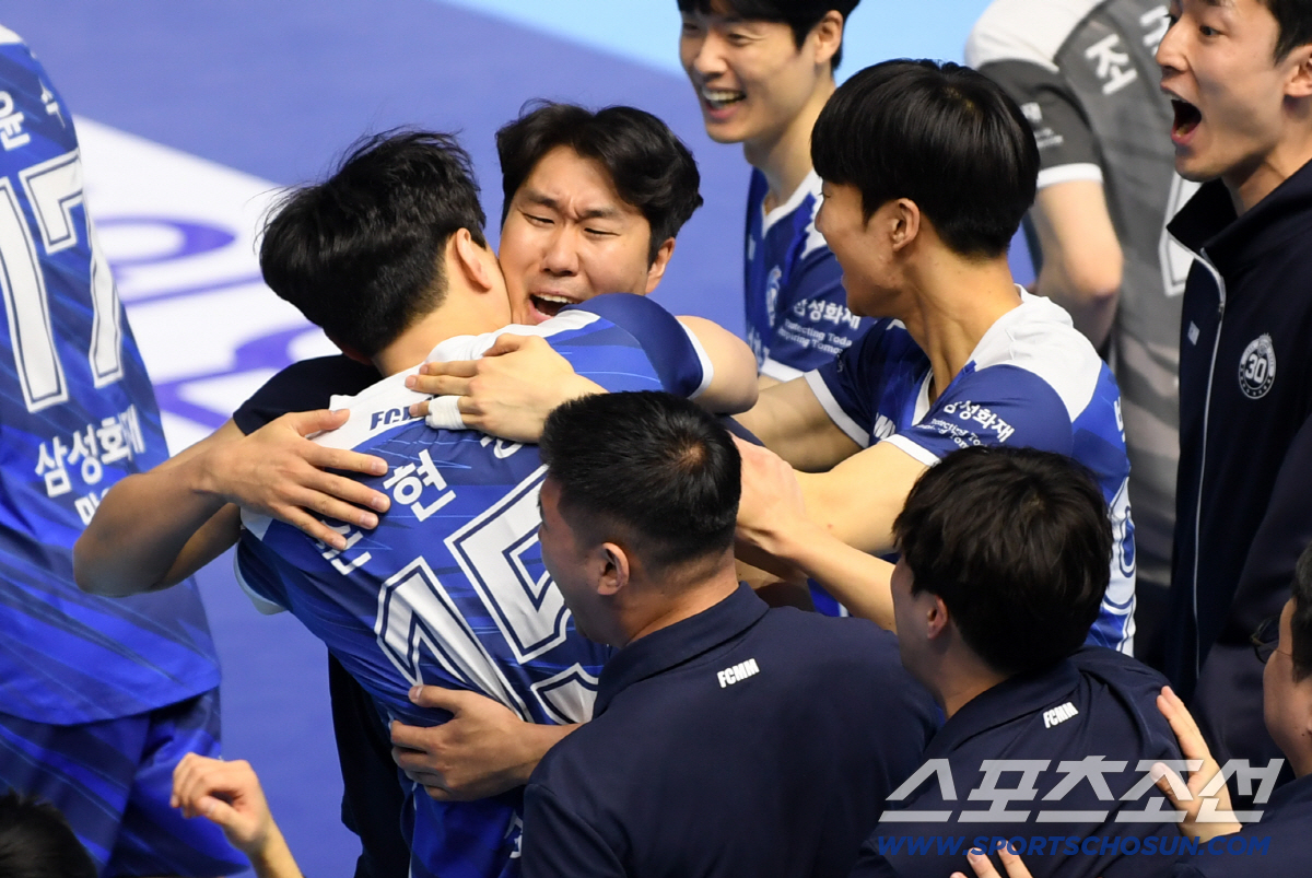1일 인천 계양체육관에서 열린 V리그 대한항공과 삼성화재의 경기. 5세트 접전 끝 승리한 삼성화재 손현종과 고준용 감독대행이 환호하고 있다. 인천=박재만 기자 pjm@sportschosun.com/2026.01.01/