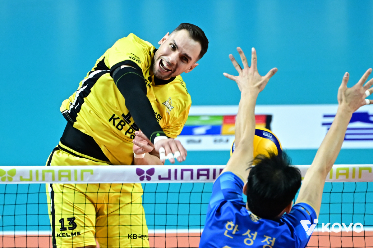 KB손해보험은 11일 장충체육관에서 열린 진에어 2025~2026시즌 V리그 남자부 4라운드 우리카드와의 경기에서 세트스코어 3대1(25-17, 26-24, 21-25, 25-19)로 승리했다.