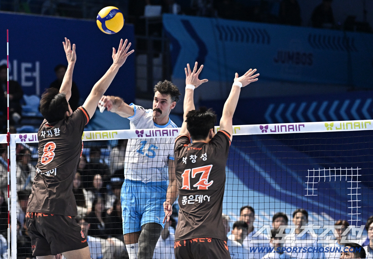 13일 인천 계양체육관에서 배구 V리그 남자부 대한항공와 OK저축은행의 경기가 열렸다. 대한항공 러셀이 OK저축은행 블로킹을 앞에 두고 스파이크를 날리고 있다. 인천=송정헌 기자songs@sportschosun.com