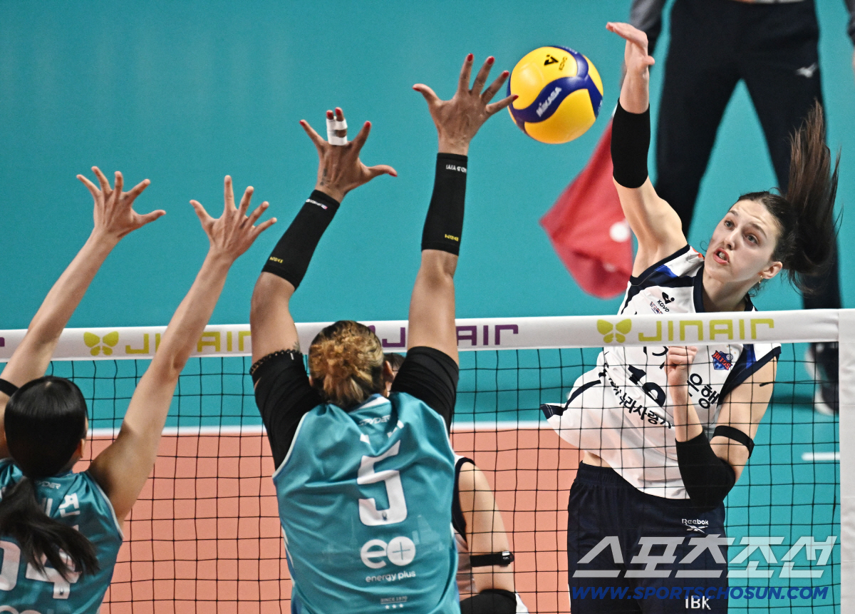 15일 서울 장충체육관에서 열린 배구 V리그 여자부 GS칼텍스와 IBK기업은행의 경기. IBK기업은행 빅토리아가 GS칼텍스 블로킹을 앞에 두고 스파이크를 날리고 있다. 장충동=송정헌 기자songs@sportschosun.com
