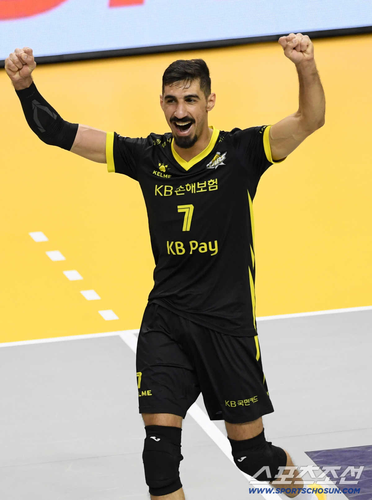 29일 의정부 경민대학교 체육관에서 열린 V리그 남자부 KB손해보험과 현대캐피탈의 경기. KB손해보험 야쿱이 득점 후 환호하고 있다. 의정부=박재만 기자 pjm@sportschosun.com/2025.11.29/